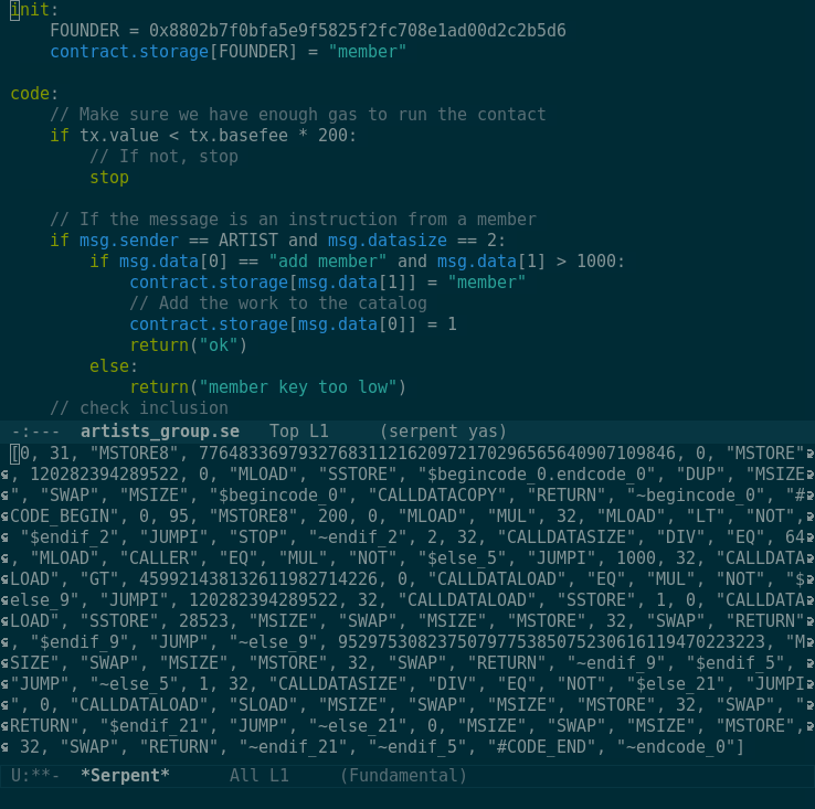 Serpent is a Python-inspired language for writing smart contracts that compile to Ethereum Virtual Machine bytecode. It adds syntax highlighting and indentation for Serpent code, and allows files to be compiled from within Emacs.