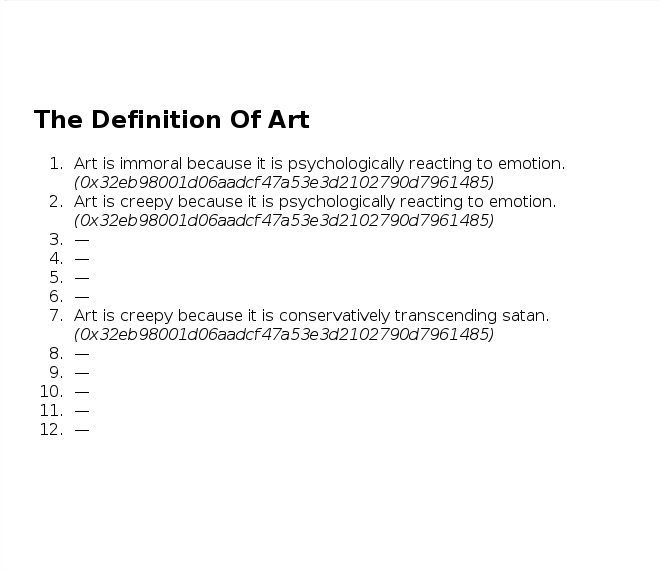 Here is a contract that allows anyone to define what art is. It contains a single set of twelve statements about art. They are encoded as hexadecimal values which are interpreted as sentences in a simple subset of International Art English and displayed by the UI.