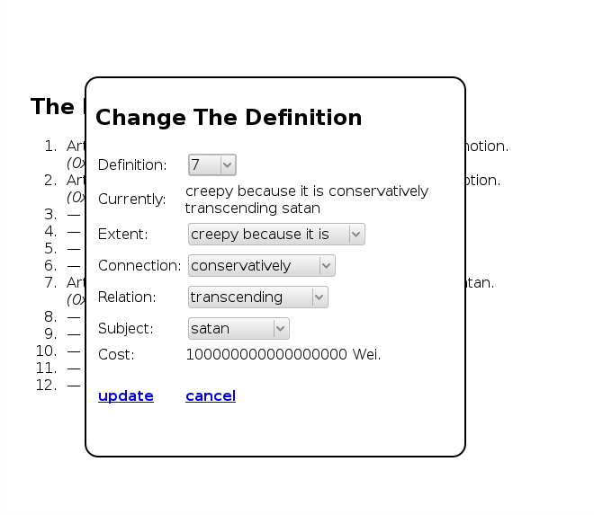 The contract allows the statements to be edited but it costs progressively more to do so: the first costs 10 Wei, the third costs 1000 and so on. This ensures that art theorists place a value on their definition, thereby indicating how confident in and/or serious about their definition they are. The higher the value, the less likely it is to be changed by someone else. This combines art theory with behavioral economics.