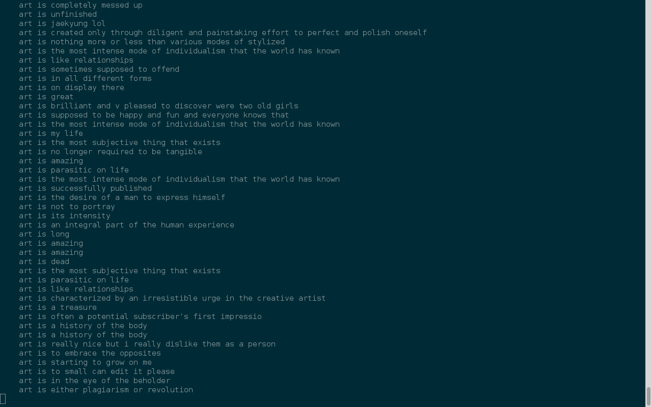 Definitions (and similar) of art from Twitter via the Streaming API. Very much inspired by “We Feel Fine”.