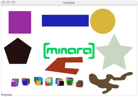 **november 2005 - **I implemented drawing tools: circle, square, rectangle, polyline, star. I hacked up a couple of demos of more generative tools: Subjects and a random walk scribble. I added a minibuffer system and a simple RGB colour picker. I also showed minara to around a hundred people at Dorokbot London 34.