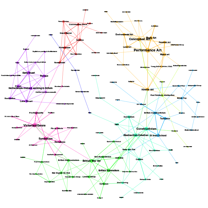 The first is into the history of art, using the Tate’s collection as a model of art in general, particularly of British art. The Tate’s collection data describes the form, content, attribution and dates of a sample of art from the past several hundred years. This is a history of art, and as long as we place it in its historical context it can be a useful one.