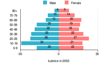 (by sex in 2002)TOTAL Males Females I. TOTAL person 345 173 172 — of which in % 100 50.1 49.9 1. BY AGE GROUP A. At pre-working age person 89 51 38 — of which in % 25.8 14.8 11 B. At working age. grand total person 191 100 91 — of which in % 55.4 29 26.4 a. at mobile working age person 122 61 61 — of which in % 35.4 17.7 17.7 b. at non-mobile working age person 69 39 30 — of which in % 20 11.3 8.7 C. At post-working age person 65 22 43 — of which in % 18.8 6.3 12.5