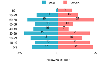 According to the 2002 Poland census, there were 282 people residing in Łukawica village, of whom 48.9% were male and 51.1% were female. In the village, the population was spread out with 25.2% under the age of 18, 34.4% from 18 to 44, 13.8% from 45 to 64, and 26.6% who were 65 years of age or older.[1]