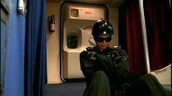 Mandy (Mia Kirshner), a freelance terrorist, moments before exploding a 747. This scene, broadcast two months after the September 11 attacks, delayed the airing of the 24 pilot. This scene was also edited for sensitive content. | |