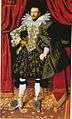 - James VI and I, 1603–1610, wears a satin doublet, wired whisk, short cape, and hose over cannions. Narrow points are tied in bows at his waist. He wears the garter and collar of the Order of the Garter.