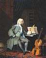 - Portrait of Georg Friedrich Händel wearing a mulberry-colored coat trimmed with bands of embroidery and fastened with buttons and loops over a pattered waistcoat (barely visible under the coat) and a white shirt with ruffles, 1749.
