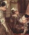 The robe à la française or sack-back gown was looser-fitting and a welcome change for women used to wearing bodices.[1] With flowing pleats from the shoulders was originally an undress fashion. At its most informal, this gown was unfitted both front and back and called a sacque. With a more relaxed style came a shift away from heavy fabrics, such as satin and velvet, to Indian cotton, silks and damasks. Also, these gowns were often made in lighter pastel shades that gave off a warm, graceful and childlike appearance.[2] Later, for formal wear, the front was fitted to the body by means of a tightly-laced underbodice, while the back fell in loose box pleats called "Watteau pleats" from their appearance in the paintings of Antoine Watteau.