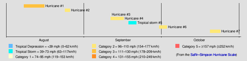 During the 1860 Atlantic hurricane season, three severe hurricanes struck Louisiana and the Gulf Coast of the United States within a period of seven weeks. The season effectively began on August 8 with the formation of a tropical cyclone in the eastern Gulf of Mexico, and produced seven known tropical storms and hurricanes until the dissipation of the last known system on October 24. Six of the seven storms were strong enough to be considered hurricanes on the modern-day Saffir–Simpson Hurricane Scale, of which four attained Category 2 status and one attained Category 3 major hurricane strength. The first hurricane was the strongest in both winds and pressure, with peak winds of 125 miles per hour (201 km/h) and a barometric pressure of 950 millibars (28 inHg). Until contemporary reanalysis discovered four previously unknown tropical cyclones that did not affect land, only three hurricanes were known to have existed; all three made landfall in Louisiana, causing severe damage.