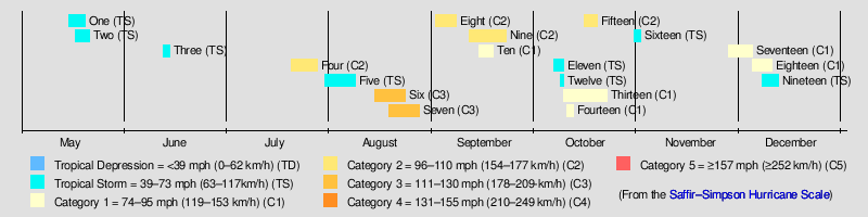 A tropical storm was discovered on late afternoon of October 15 and was named Tropical Storm Fifteen on that day with 80 mph (130 km/h) winds. From October 15 to 16th, Fifteen peaked at 105 mph (169 km/h) winds making it a Category 2 hurricane. Fifteen stayed out to sea and dissipated on October 19.