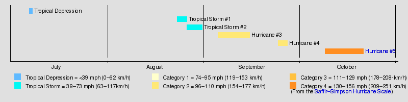 The season's first storm had limited reported impacts on land, and the subsequent system caused more severe damage in southern Texas and northern Mexico. Hurricane Three dropped torrential rainfall on Puerto Rico before striking the same region as the previous cyclone. Hurricane Four bypassed Bermuda to the east, where some property damage was reported. Hurricane Five was the most catastrophic storm of the season, buffeting western Cuba for an extended period of time as it slowly executed a counterclockwise loop. Death tolls from the hurricane are estimated in the hundreds.