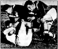 First it was West Coast five-eighth George "Geordie" Menzies forced off with a cheekbone broken by a French head-butt. Then it was Otago's 1946 All Black halfback, Jimmy Haig with a broken jaw. Also Charlie McBride was bitten.[36]