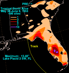 After passing near Cuba, Alice turned to the north and restrengthened to peak winds of 70 mph (110 km/h) (in fact, it is possible Alice briefly reached hurricane intensity but data was inconclusive). It again weakened before making landfall near Panama City Beach on June 6 as a minimal tropical storm, and Alice dissipated shortly thereafter.[3] Alice brought heavy rainfall to Florida, peaking at 13.48 inches (342 mm) in Lake Placid. Near where it made landfall, the storm dropped light rainfall, and there were no reports of damage in the state.[6][3] Alice was the first North Atlantic tropical cyclone to have a female name.[7] It was also one of 22 tropical or subtropical cyclones on record in the month of May.[8]