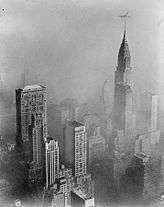 ![]() A view of the skyline looking south from the Empire State Building at 8:30 a.m. November 24, 1966. The photo was taken by Neal Boenzi and published on the front page of the November 25, 1966 edition of the The New York Times.[1] Roy Popkin of the EPA said the "surrealistic" image made Lower Manhattan look like a "Cloud City".[2] | |