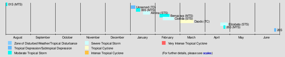 | Elizabeta | April 20 – 29 | Severe Tropical Storm | 95 km/h (60 mph) | 976 hPa (28.82 inHg) | Madagascar | None | None | |