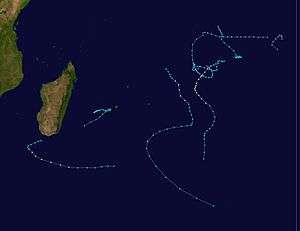During the season, the Météo-France office (MFR) on Réunion island issued warnings in tropical cyclones within the basin. Using satellite imagery from National Oceanic and Atmospheric Administration, the agency estimated intensity through the Dvorak technique, and warned on tropical cyclones in the region from the coast of Africa to 90° E, south of the equator. The World Meteorological Organization would later label the MFR as a Regional Specialized Meteorological Center in 1993.[1] The Joint Typhoon Warning Center (JTWC), which is a joint United States Navy – United States Air Force task force, also issued tropical cyclone warnings for the southwestern Indian Ocean.[2] The season's five named storms and one tropical cyclone – a storm attaining maximum sustained winds of at least 120 km/h (75 mph) - were both below the average of nine and five, respectively.[3] The MFR considered the tropical cyclone year to begin on August 1 and continue to July 31 of the following year.[1] There was an ongoing El Niño by December,[4] and by January, the monsoon was weaker than normal across the region.[5] This caused below normal thunderstorm activity in February.[6]