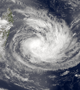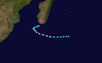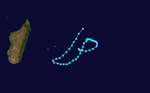 While Bemezava was still active, another circulation was present between Réunion and Madagascar on February 8. On the next day, a tropical disturbance formed about 150 km (95 mi) east-southeast of Toamasina, Madagascar. A ridge to the south caused the nascent system to move erratic, although generally to the southeast and east. It intensified into Tropical Storm Clotilda on February 10,[16][17] and on the next day that the JTWC classified it as Tropical Cyclone 17S.[2] The storm slowed and approached within 50 km (30 mi) of Réunion before stalling. It moved slowly near the island for two days, during which it remained about 30 km (18 mi) off the northern coast. On February 13, Clotilda attained peak 10 minute winds of 110 km/h (70 mph). A weak ridge steered the storm back to the southwest, and on February 14, Clotilda struck northern Réunion at Sainte-Suzanne. The ridge moved to the east, causing the storm to accelerate and gradually weaken. On February 17, Clotilda became extratropical while turning southeastward due to an approaching trough. The remnants persisted several days until dissipating on February 22 near Île Amsterdam.[16][17]