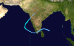 A monsoon depression became more tropical on October 14 in the Bay of Bengal. It traveled northwestward, becoming a tropical storm on the 15th and hitting southeastern India as a 50 mph storm that night. It rapidly dissipated over land.