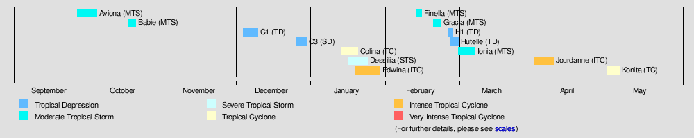 During the season, the Météo-France office (MFR) on Réunion island issued warnings in tropical cyclones within the basin. The agency estimated intensity through the Dvorak technique,[4] and warned on tropical cyclones in the region from the coast of Africa to 90° E, south of the equator.[5] The Joint Typhoon Warning Center (JTWC), which is a joint United States Navy – United States Air Force task force, also issued tropical cyclone warnings for the southwestern Indian Ocean.[6] The storms in the season lasted about five days on average, although Cyclone Edwina lasted the longest at 11 days. Storms formed throughout the basin and were fairly evenly distributed throughout the season, with the exception of a lull in November. Most storms originated from the Intertropical Convergence Zone (ITCZ). MFR named storms throughout the season using 11 names from a sequential list.[4] The remainder of the list was Laura, Monette, Neige, Octavie, Pamela, Rosita, Stella, Tasiana, Vigonia, Wendy, and Yolande.[7]