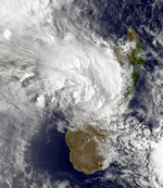 A large low pressure area persisted on February 11 across northern Madagascar, centered near Cape Masoala along the country's eastern coast. Moving southward and later southeastward due to a trough, the system developed into a tropical disturbance on February 12 and slowly organized.[4] On the next day, the JTWC began tracking the system as Tropical Cyclone 19S.[6] The MFR upgraded the system to Tropical Storm Finella on February 14 after an eye feature developed within the central dense overcast.[4] As a result, the JTWC upgraded the system to the equivalent of a minimal hurricane that day, estimating peak 1-minute winds of 130 km/h (85 mph), although the MFR only estimated peak 10-minute winds of 80 km/h (50 mph).[14] Increased wind shear weakened Finella, and it was no longer a tropical depression on February 15. The remnants affected Réunion, bringing localized heavy rainfall; Saint-Benoît along the east coast recorded 1,074 mm (42.3 in) of precipitation in 24 hours, including 122 mm (4.8 in) that fell in just one hour. The southern portion of the island received minimal rainfall, in contrast.[4]