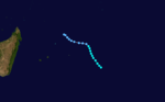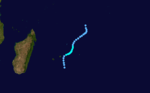 On February 8, a tropical low formed just north of Western Australia from the remnants of Cyclone Katrina, which earlier formed off the east coast of Australia. The low moved generally westward due to a strong ridge to the south. Given the name Victor, the storm intensified to a peak of 120 km/h (75 mph) before weakening steadily due to increased wind shear. On February 14, the storm weakened to tropical depression status.[20] Victor crossed into the south-west Indian Ocean on February 16 with a well-defined circulation but little convection. Despite being downgraded to a tropical disturbance, the system was named Cindy by the Mauritius Meteorological Service on February 16. The system continued gradually weakening while turning more to the southwest, dissipating on February 19.[1] This marked a 50‑day period in which the same system was active.[20]