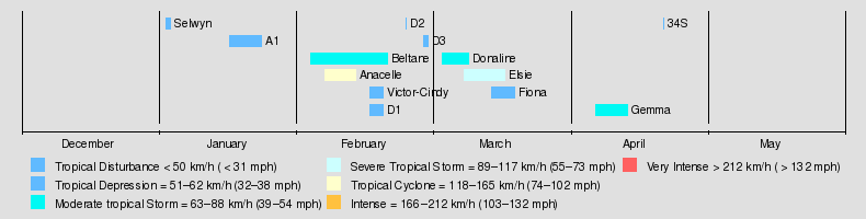 The season had the latest start in 30 years, with the first depression forming in January.[1] The first storm, Anacelle, was not named until February 8, which retains the record for the latest date of the first named storm.[4] For the early portion of the season, there were unusually quiet conditions across much of the basin, along with higher than normal pressure. The intertropical convergence zone (ITCZ) associated with the monsoon only became active in February, allowing tropical cyclogenesis to occur more frequently. There were six tropical storms during the season, of which only one attained tropical cyclone status; these are below the averages of 9 and 4, respectively. No storms attained intense tropical cyclone status. The season's low activity contrasted that of the previous season, which was much more active. There were 18 days in which a storm was active, the lowest since 1982–83. An ongoing El Niño was evident during the season.[1]
