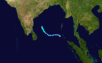 On January 30, an area of disturbed weather began to develop. Convection began to form around the center and a Tropical Cyclone Formation Alert was issued the next day by the JTWC. Development of the storm stalled and the alert was cancelled. The next day, another TCFA was issued but was once more cancelled. Finally, on February 2, after the third TCFA was issued, the low pressure area developed into a tropical storm at 0900Z 370 nm west of Phuket, Thailand. The storm slowly intensified and reached its peak of 45 mph (1-min) on February 3. Shortly after peaking in intensity, vertical wind shear weakened the storm and the low became exposed by 1800Z the same day. The storm later dissipated on February 5 without making landfall.[2]