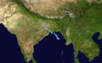 On June 8, an area of low pressure formed 235 nm south of Chittagong, Bangladesh. The low slowly developed over the next two days while drifting to the west and northwest. On June 10, a TCFA was issued at 0830Z and the first warning on Tropical Storm 03B was issued at 1500Z the same day. The storm made landfall as a minimal tropical storm to the west of Calcutta, India later that day. 03B rapidly weakened due to vertical wind shear and the interaction with land and dissipated on June 11. No fatalities or damages have been associated with 03B.[4]