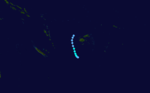 In addition to the storms listed above, the FMS monitored several weak tropical depressions and a tropical disturbance throughout the season. On December 8, Tropical Depression 02F developed near Fiji.[18] Tracking westward, the system attained a peak intensity of 45 km/h (30 mph) with a minimum pressure of 1000 mbar (hPa; 29.53 inHg) before weakening took place.[19] By December 10, the system transitioned into an extratropical cyclone.[18] Over the following several days, the remnants of the depression drifted southeastward and were last noted on December 15 to the southeast of Fiji.[19] On January 15, Tropical Depression 06F formed about 835 km (520 mi) west-northwest of Noumea, New Caledonia. Embedded within a monsoon trough,[11] the system tracked generally eastward and attained peak winds of 65 km/h (40 mph).[12] The strongest winds were located well to the south of the system in a peripheral band. By January 16, the system began weakening as it interacted with a frontal system near New Caledonia before completely losing its identity later that day.[11] On January 20, a large tropical depression, designated 07F, formed about 325 km (200 mi) northwest of Fiji. A monsoonal system, the depression failed to organize a definite center and relocated several times throughout its existence. Between January 21 and 24, gale warnings were issued in association with the cyclone due to a strong pressure gradient between it and an anticyclone to the south.[11] Tracking generally southwestward, the system slowly deepened, attaining a minimum pressure of 997 mbar (hPa; 29.44 inHg) early on January 27 before the FMS discontinued advisories on the storm.[11][20]