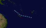 On February 17, a tropical depression formed about 555 km (345 mi) northeast of Fiji and tracked southward. A strong convergence east of the depression produced an area of 65–75 km/h (40–45 mph) winds with gusts to 95–110 km/h (60–70 mph). The system was last noted on February 18 well to the southeast of Fiji.[14][21] On February 26, Tropical Disturbance 11F formed 695 km (430 mi) north of Noumea, New Caledonia. A weak system, having winds no more than 30 km/h (15 mph), it remained nearly stationary for about a day before the FMS discontinued advisories on the disturbance.[14] Tropical Depression 14F formed on March 20 about 120 km (75 mi) southeast of Pago Pago, American Samoa. Initially the system was quasi-stationary; however, it was relocated the following day due to its broad size. The depression subsequently drifted west-southwestward and was last noted on March 23 when it was located approximately 835 km (520 mi) south-southeast of Fiji. Throughout its existence, gale warnings were issued along the periphery of the system due to a pressure gradient between the cyclone and an area of high pressure northeast of New Zealand.[16] On April 1, Tropical Depression 15F formed well to the northwest of New Caledonia. The depression drifted east-southeast before dissipating the following day. The last cyclone of the season, Tropical Depression 16F, formed on April 17 about 595 km (370 mi) north-northeast of Port Vila, Vanuatu. After relocating substantially to the south, the depression moved slowly in the same general area for several days before dissipating on April 22.[22] For unknown reasons, the numbering for the 2001–02 season was used for the first system of the 2002–03 season, Tropical Depression 17F, which formed on July 3.[23]
