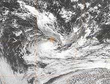In Gary Pagett's April 2002 monthly tropical cyclone summary, he noted a possible tropical cyclone over the southeast Pacific that displayed features of a tropical or subtropical cyclone.[22] Operationally, the Tropical Cyclone Warning Center in Wellington, New Zealand only issued gale warnings on the system as it was not assessed to have been tropical or subtropical.[24] The system was later studied by Dr. Karl Hoarau of Cergy-Pontoise University in France and is believed to have been a tropical storm.[22] At the end of March, an upper-level trough associated with a cold front developed over the southeast Pacific Ocean. By March 31, a low-level circulation had developed roughly 600 km (375 mi) east of the Pitcairn Islands. Despite moderate wind shear, the system intensified and became a tropical depression early on April 1. Owing to a subtropical ridge to the north, the depression tracked west-southwestward into an area of decreased shear. Subsequently, the system was able to intensify into a tropical storm by the evening of April 2. Though the storm remained shear, it quickly intensified throughout April 3 with convection remaining within half a degree of the center of circulation.[24] During the evening hours, an eye-like feature appeared on satellite imagery, and the system simultaneously was estimated to have reached its peak intensity as a strong tropical storm with one-minute winds of 100 km/h (65 mph).[22][24] Hours later, dry air became entrained in the storm's circulation and caused it to rapidly weaken to a tropical depression. By the afternoon of April 4, the low had become fully exposed and the system was no longer classified a tropical cyclone.[24]