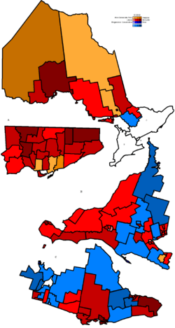 The Liberals won a huge majority with 72 seats, almost 70% of the 106- seat legislature. The Liberals not only won almost every seat in the city of Toronto, but every seat bordering on Toronto as well. All seven seats in Peel region went Liberal, as well as previously safe PC 905 seats like Markham, Oakville and Pickering-Ajax. The Liberals also made a major breakthrough in Southwestern Ontario, grabbing all three seats in London as well as rural seats like Perth-Middlesex, Huron-Bruce and Lambton-Kent. If the story of the PC majorities in 1995 and 1999 were the marriage of rural and small-town conservative bedrock with voters in the suburbs, the 2003 election was a divorce of those suburban voters from rural Ontario and a new marriage to the mid-town professionals and New Canadians who make up the Liberal base.