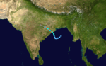 The deep depression made landfall near Kakinda early on June 22 local time.[22] The JTWC issued its final advisory later, as the system began to weaken due to land interaction and wind shear.[23] The next day, the IMD downgraded it to a depression while it crossed the Deccan Plateau.[24] The final warning was issued on June 24, despite the storm having moved into the Arabian Sea. The storm killed at least 140 people in India,[25] and another 213 people died in Karachi, Pakistan from rains and winds that might have been associated with an outer band of the cyclone.[26] The Pakistan Meteorological Department (PMD) had warned of heavy rains and wind from the system as early as Friday June 22.[27]