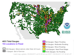 100 populated locations were experiencing major or moderate flooding on May 8, 2011.