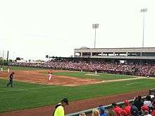 The Angels came into the Spring with high expectations for the following 2012 campaign due to the large amount of money spent by owner Arte Moreno in the offseason signing slugger Albert Pujols and lefty C. J. Wilson. Both prized acquisitions played in the Angels first spring game against the Athletics and the two did not disappoint: Pujols went 2 for three with 1 run scored and 1 run batted in while Wilson threw 2 complete innings with no runs and giving up only one hit. Because of the high expectations for the Angels in 2012, the Angels are expecting larger than usual crowds in Tempe this spring. One of the biggest questions surrounding the Angels franchise going into the Spring training was whether or not Kendrys Morales would make a comeback from breaking his ankle in 2010. Morales played in his first baseball game in nearly two years on March 16, 2012 in a minor league game and played in his first major league game of any kind on March 22.[16] In that game, Morales went two for three with a run scored and was described by Angels personnel and Morales as a large step forward for the slugger.[17] On March 23, in a split squad game against the Cleveland Indians in Goodyear, Morales again went two for three with a run scored in only his second game of the spring, but this time with his first home run since the 2010 regular season.[18] According to the Angels radio broadcaster Terry Smith, the Angels have already sold out six home games at Tempe Diablo Stadium. The first sell-out crowd of the spring was for an Angels loss to the San Diego Padres on March 9. The Angels finished their spring training slate of games on April 4, 2012 with a record of 19–12–2, good for 3rd place in the Cactus League in terms of win percentage and 2nd in terms of number of wins (19). The average attendance at Tempe Diablo Stadium was 8,675 (total of 130,126) which was an average of 90.76% capacity. The Angels also sold out 9 of their 15 home Cactus League games.