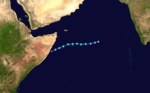 Under the influence of an active Inter-Tropical Convergence Zone, a low pressure area formed over the Arabian Sea near 7.3°N and 70.7°E on 18 December. It slowly tracked westwards, organizing itself and intensifying into a Depression by 0900 UTC of 22 December.[37] The Joint Typhoon Warning Center (JTWC) upgraded the storm into a Tropical Cyclone by 0300 UTC of 23 December,[38] followed by Deep Depression status by the morning hours of the same day. However the storm encountered strong vertical wind shear and colder sea surface temperatures on 24 December,[37] causing its low-level circulation center to become fully exposed, prompting JTWC to issue its final advisory on the storm. Further weakening ensued as land interaction increased, and the IMD downgraded ARB 02 into a low pressure area on 25 December.[39]