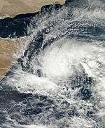 On October 23, the IMD reported that a depression had developed out of an area of low pressure about 800 km (495 mi) to the west of India's Amindivi Islands.[9] The storm then tracked westwards and intensified into a Deep Depression by 18:00 UTC on the same day, followed by a Tropical Cyclone Formation Alert issued by the Joint Typhoon Warning Center at 20:00 UTC.[10] Late on October 24, the IMD upgraded depression ARB 01 to a cyclonic storm, officially naming it Murjan. Murjan became the first cyclonic storm of the season.[11] The cyclone continued tracking westward at 14 knots (26 km/h; 16 mph). Microwave satellite imagery depicted that most of the convection remained to the south of the system. At that time, Murjan was tracking just south of a subtropical ridge in an environment with low vertical wind shear.[12] The storm crossed the coast of Somalia by late 25 October and gradually weakened into a depression.[13] The India Meteorological Department issued their final bulletin for Murjan at 0600 UTC of 26 October 2012.[14]