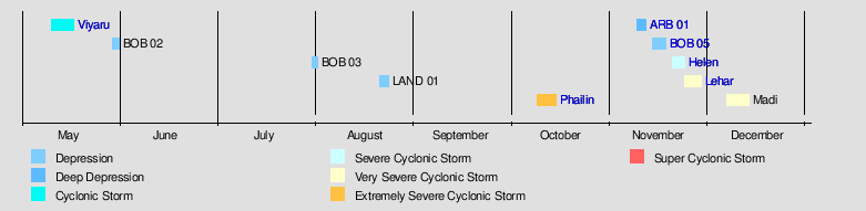 This is a table of all storms in the 2013 North Indian Ocean cyclone season. It mentions all of the season's storms and their names, durations, peak intensities (according to the IMD storm scale), landfall(s) – denoted by bold location names – damages, and death totals. Damage and death totals include the damage and deaths caused when that storm was a precursor wave or extratropical low, and all of the damage figures are in 2013 USD.