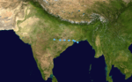 An upper air cyclonic circulation developed into a low pressure area on May 28. It slowly organized itself, and favorable conditions led to the intensification of the low pressure area to a depression by the early hours of May 29.[23] Slightly intensifying thereafter, the storm took a northward track and crossed the West Bengal coast in the evening hours of the same day, with peak winds of 45 km/h (28 mph).[24] The depression attained its minimum central pressure of 990 mbar (29 inHg) on May 30. Staying almost a day inland maintaining depression strength, it weakened gradually and dissipated over the states of Bihar and Jharkhand in the evening hours of May 31 due to land interaction and reduced moisture availability.[25] Contai in West Bengal received 260 mm of rainfall in 24 hours on May 30.[26]