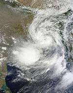 Late on November 17, the remnant energy of Tropical Storm Podul contributed to the development of a trough over the Bay of Bengal, located near the Andaman Islands. During the next couple of days, the storm slowly organized and consolidated, prompting the Joint Typhoon Warning Center (JTWC) to issue a Tropical cyclone formation alert (TCFA) during the early hours of November 19.[59] Later on the same day, the India Meteorological Department (IMD) upgraded the storm to a depression, classifying it as BOB 06,[60] followed by the JTWC reporting that the storm had reached Tropical Storm strength.[61] A couple of hours later, the IMD upgraded BOB 06 into a Deep Depression, as the storm continued to intensify.[62]