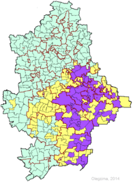 When President Poroshenko announced that he had called early parliamentary elections for 26 October 2014 on 25 August 2014,[8] in the Donbass region of Eastern Ukraine (Donetsk Oblast and Luhansk Oblast[45]) pro-Russian separatists controlled several of the region's government buildings and towns (since mid-April 2014).[33][46] By August 2014 the Ukrainian army and these pro-Russian separatists were fighting the War in Donbass.[12][47] In the May 2014 Ukrainian presidential election only 20% of the ballot stations were open in Donbass due to threats and violence by these pro-Russia separatists.[48][49] Since the July 2014 post-ceasefire government offensive the pro-Russian separatist control a smaller chunk of the Donbass region than in May 2014.[50] According to the Central Election Commission of Ukraine, (in early September 2014) 32 constituencies were located within the territory of the War in Donbass.[14] In the 2012 Ukrainian parliamentary election the Donbass was divided in 32 constituencies.[15] On 21 October 10 of the 21 constituencies of Donetsk Oblast elections were expected to go through while 3 (other) constituencies were considered "problematic".[51] In Luhansk Oblast elections were expected to be held in 5 of its 11 constituencies.[52] 14.26% (5,061,489) of Ukraine's 35,500,913 eligible voters live in Donbass.[50] According to the Central Election Commission of Ukraine over 30,000 of them were able to vote without changing their electoral address.[53] On 9 October they also predicted that 1.46 million voters in Donetsk Oblast (out of the approximately 3.3 million) and 560,000 (out of the approximately 1.8 million) in Luhansk Oblast would be able to vote.[54] On 25 October (one day before the election) the Central Election Commission of Ukraine announced that there will be no voting in 9 constituencies in Donetsk Oblast and 6 constituencies in Luhansk Oblast.[1] On election day in Luhansk Oblast all polling stations were opened in only 1 of the 5 constituencies where voting was possible, in Donetsk Oblast this was so in 6 out of the 12 constituencies.[55] In some constituencies in Donbass only a handful of polling stations were open; this led to Yukhym Zvyahilsky winning a seat with only 1,450 votes (or 72% of the total votes cast).[56]