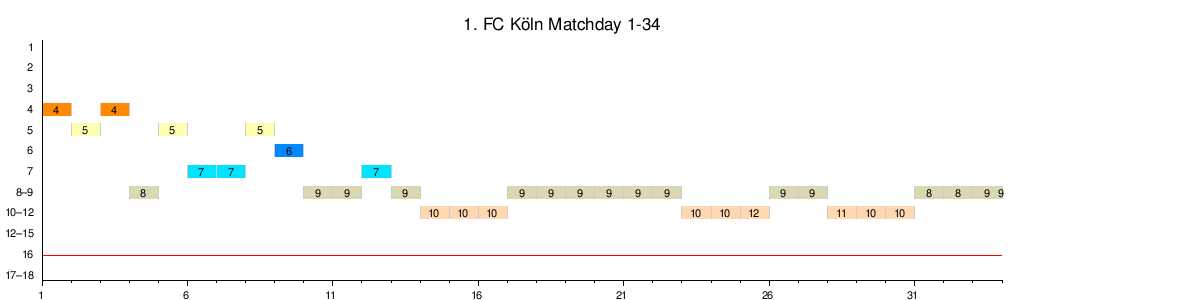| 9 | 1. FC Köln | 34 | 10 | 13 | 11 | 38 | 42 | −4 | 43 | |