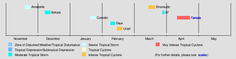 The season started on November 19, with the formation of Annabelle. After a month of inactivity, Bohale formed, but was fairly weak, and only reached moderate tropical cyclone strength. Another month passed before Corentin formed on January 20. The basin became somewhat active with Daya forming, and Uriah entering the basin in February, the climatological most active month of the season. Emeraude formed in March, quickly peaking at intense tropical cyclone strength, before quickly weakening. Also, an unmonitored tropical depression entered the basin, but became extratropical soon after. Tropical Cyclone 07 formed at the end of March. The storm was operationally declared a depression, but was upgraded in post-storm analysis to a moderate tropical cyclone. In April, the season began to wind down. Very Intense Tropical Cyclone Fantala formed near the end of the month, and reached peak intensity as the strongest tropical cyclone of the basin in terms of sustained winds. Fantala dissipated on April 24, ending the season.