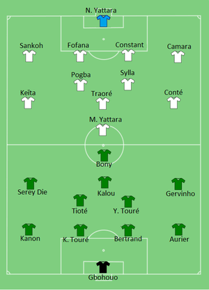 Guinea took the lead in the 36th minute when Mohamed Yattara smashed home a headed clearance from the Ivory Coast defence. Gervinho was sent off in the 58th minute for hitting Naby Keïta in the face, but the 10-men Ivory Coast equalized in the 72nd minute, as Wilfried Bony controlled the ball on his chest and passed to Seydou Doumbia to score.[5][6]
