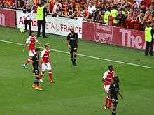Arsenal made their first summer signing prior to start of the current season on May 25, with the acquisition of Swiss midfielder Granit Xhaka for a reported £30 million fee. Xhaka's involvement in Euro 2016 and his subsequent desire to secure his club future beforehand enabled Arsenal to uncharacteristically complete a signing before the formal opening of the transfer window.[1] In the following weeks, the Gunners activated the release clause of Leicester City forward Jamie Vardy.[2] However, they failed in their attempts to bring Vardy from the Premier League champions, with the England forward instead opting to sign a contract extension with the East Midlands club.[3] Manager Arsène Wenger came under fire for failing to secure the transfer, and fans were outraged further when Arsenal signed young forward Takuma Asano from Sanfrecce Hiroshima,[4] due to the relative unproven nature of the forward's capabilities. Arsenal made their third summer signing on July 22, signing Bolton's Player of the Year, Rob Holding. He joined for a reported £2 million fee from the League One side.[5] Arsenal played Lens later that day in their first pre-season game, with a late chipped goal from Alex Oxlade-Chamberlain earning Arsenal a hard-fought 1–1 draw.[6] Arsenal then flew out to California for two more pre-season fixtures, against the MLS All-Stars and Chivas Guadalajara. Wenger would state that Per Mertesacker would not be on the tour, after picking up an injury against Lens. He would later confirm that Mertesacker had surgery in his native Germany, and would be out for 'months'.[7] Arsenal beat the All Stars 2–1 on July 28 (July 29 BST), with a Joel Campbell penalty and a Chuba Akpom close-range finish coming either side of a goal from Didier Drogba.[8] Arsenal concluded their tour on July 31 (August 1 BST) with a 3–1 win over Chivas. Oxlade-Chamberlain and Akpom scored their second pre-season goals each, with the opener scored by Holding.[9] Wenger confirmed that the injury to Mertesacker meant he'd need to sign a replacement ideally or before the season opener against Liverpool on August 14,[10] as talks of incoming transfers intensified.