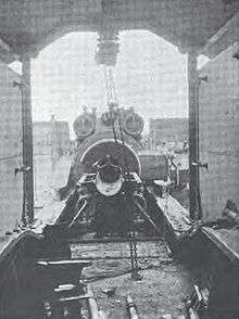 The E. u. B. could fire from any suitable section of track after curved wedges were bolted to the track behind each wheel to absorb any residual recoil after the gun cradle recoiled backwards. It also had a pintle built into the underside of the front of the mount. Two large rollers were fitted to the underside of the mount at the rear. Seven cars could carry a portable metal firing platform (Bettungslafette) that had a central pivot mount and an outer rail. It was assembled with the aid of a derrick or crane, which took between three and five days, and railroad tracks were laid slightly past the firing platform to accommodate the front bogies of the gun. The gun was moved over the firing platform and then lowered into position after the central section of rail was removed. After the gun's pintle was bolted to the firing platform's pivot mount, the entire carriage was jacked up so that the trucks and their sections of rail could be removed. The carriage was then lowered so that the rear rollers rested on the outer track. Concrete versions were also used. It could have up to 360° of traverse. The E. u. B. retained 2° 15' of on-mount traverse for fine aiming adjustments.[3]