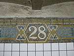 This underground station, which opened on July 1, 1918, has four tracks and two side platforms. The two center express tracks are used by the 2 and 3 trains during daytime hours. Both platforms have their original mosaic trim line, name tablets, and directional signs. Vent chambers are present and there is a closed newsstand on the northbound platform as evidenced by sealed windows on the walls. Blue i-beam columns run along both platforms at regular intervals with black "28" plate signs in white numbering on every other one.