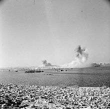 The Official History records that the AA artillery in Tobruk was 'incessantly in action against attacks of all kinds, from all heights, but especially by dive-bombers'.[32] The regimental historian notes that these Stuka attacks concentrated on gun positions, which was a serious threat to HAA sites, whose instruments could not cope with the rapid height changes. The gunners devised a tactic of opening fire with short fuzes just before the dive started, to force the pilots to fly through a ring of bursts. The battery cooks, drivers and clerks then joined in, firing machine-guns and captured 20mm Breda guns. This aggressive method was known as 'Porcupine', and was so effective that the Luftwaffe changed to high-level bombing. Each mobile HAA troop established at least one alternative site and the guns were regularly switched between them, the empty sites being rigged up as dummies. The two available gun laying (GL Mk I) radar sets had to be positioned away from the vulnerable gun sites and used for early warning to supplement the single RAF radar, and a ring of searchlights operated round the harbour at night. Harbour defence was by pre-arranged barrages by five of the six HAA troops, the sixth troop remaining on watch for other raiders. 152 Battery dug in west of the harbour engaged 1000 enemy aircraft in a six-month period. 4th AA Brigade recorded that there was a steady decline in numbers of aircraft attacking as the siege went on, with the attackers switching to high-level and night attacks. In the last two months of the siege, troops of HAA guns took it in turn to move out to the perimeter and take on ground targets under the control of 9th Australian Division. Their long-range harassing fire made up for the shortage of medium artillery. In September 1941, the batteries of 51st HAA Rgt were relieved and left Tobruk by sea to rejoin RHQ for rest and refit in Palestine.[33][34]