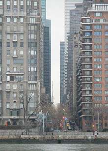 53rd Street is a midtown cross street in the New York City borough of Manhattan, that runs adjacent to buildings such as the Citigroup building. It is 1.83 miles (2.94 km) long. The street runs westbound from Sutton Place across most of the island's width, ending at DeWitt Clinton Park at Eleventh Avenue.