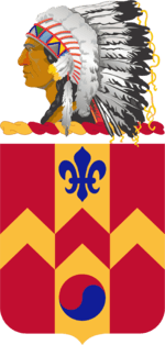 Description A Gold color metal and enamel device 1 3/8 inches (3.49 cm) in height overall consisting of a shield blazoned: Gules a pale Or and a bar dancette counterchanged between in chief a fleur-de-lis Azure and in base a Taeguk in the national colors of Korea (Scarlet over Blue). Attached above from a wreath Or and Gules (Yellow and Scarlet), an Indian’s head with war bonnet all Proper. Attached below and to the sides of the shield a Gold scroll inscribed “TRADITION PRIDE SUPPORT” in Black letters.